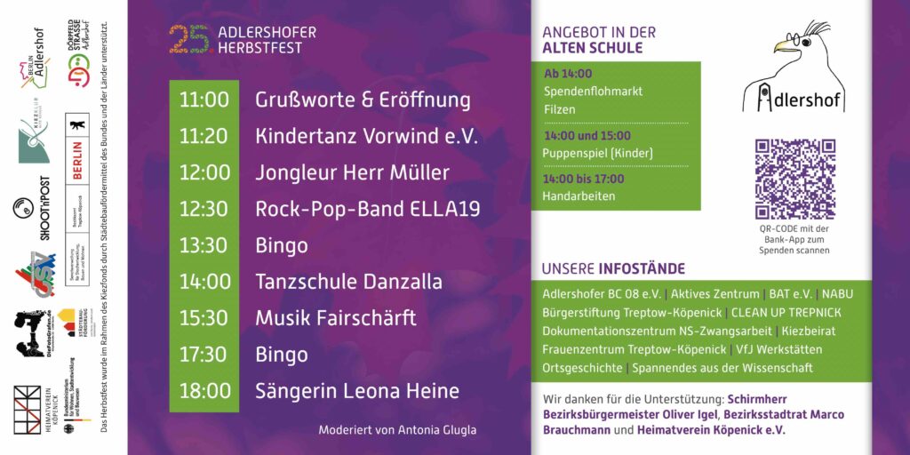 Am Samstag, den 27. September 2025, lädt das Adlershofer Festkomitee von 11 bis 19 Uhr zum 25. Adlershofer Herbstfest in das Kulturzentrum Alte Schule ein. Mit einem vielfältigen Bühnenprogramm, einem bunten Kinderfest und zahlreichen Mitmach-Angeboten wird das Jubiläum zu einem besonderen Ereignis für die ganze Nachbarschaft.